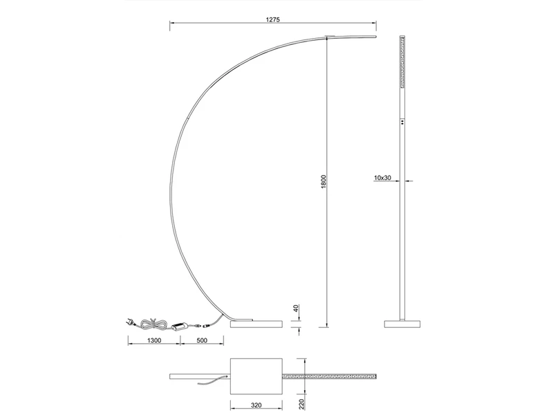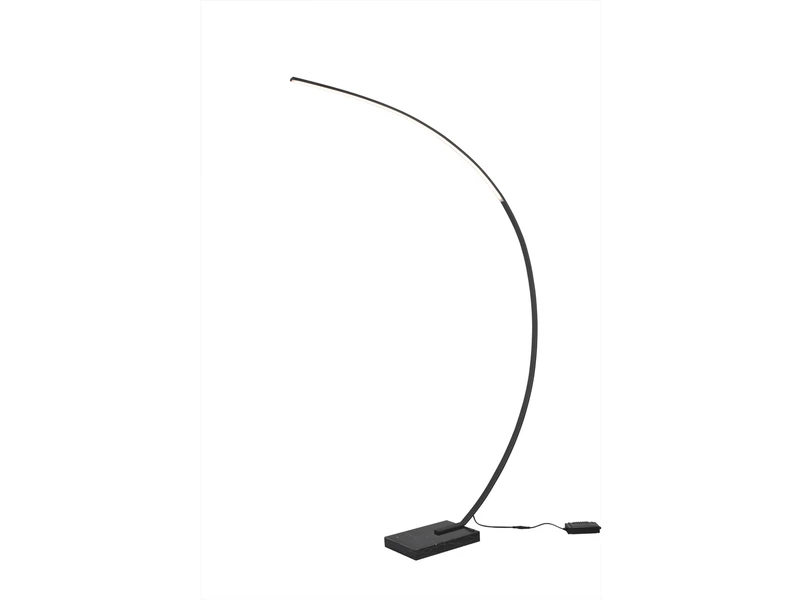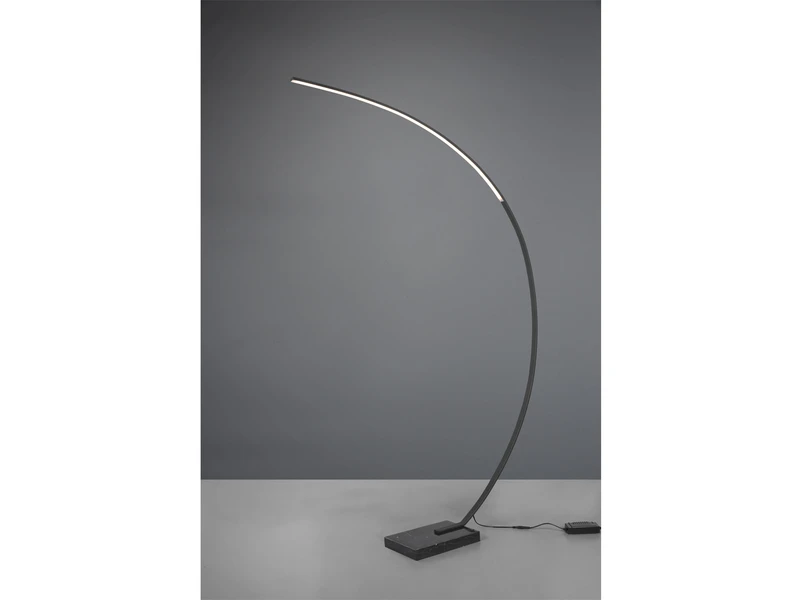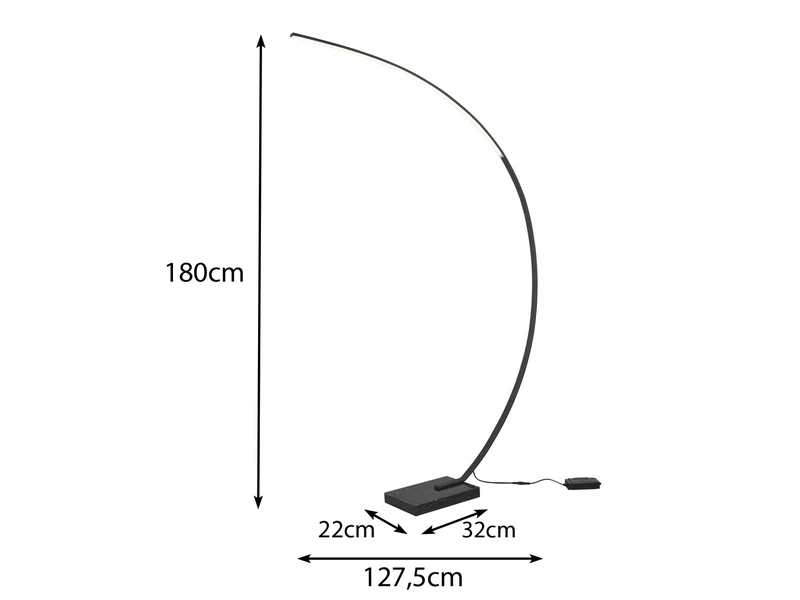 Die schlichte Farbgestaltung in Schwarzmatt, hinterlässt in Kombination mit dem schwarzen Marmorfuß ein modernes Erscheinungsbild und ermöglicht außerdem ein leichtes integrieren mit vorhandenem Interior. Die Bogenlampe hat eine Höhe von 180cm und eine Ausladung von 127,5cm.