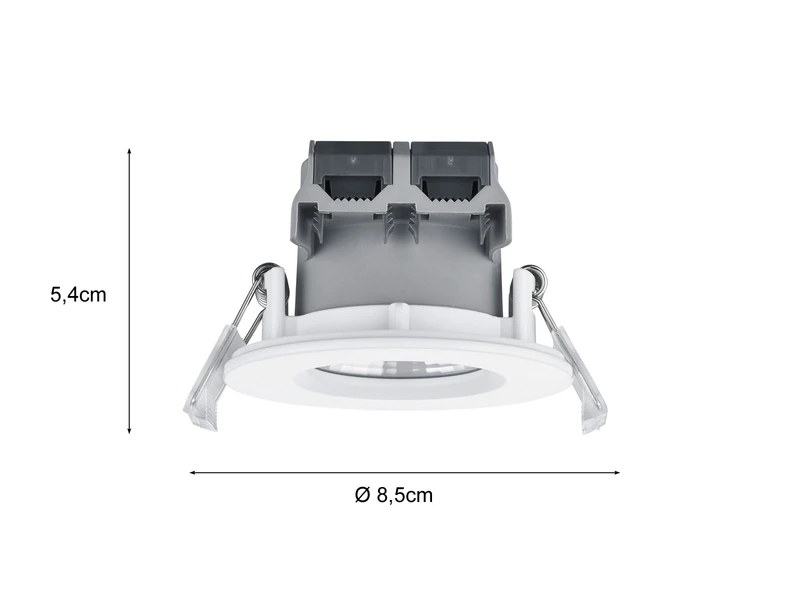Die Einbaulampe aus Metall hat einen Durchmesser von 8,5 cm und eine Höhe von 5,4 cm. Für den Einbau wird ein 7,2 cm großer Ausschnitt und eine Einbautiefe von min. 6,8 cm benötigt.