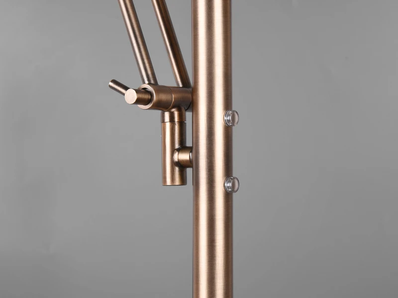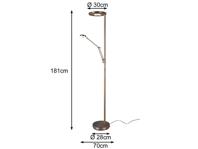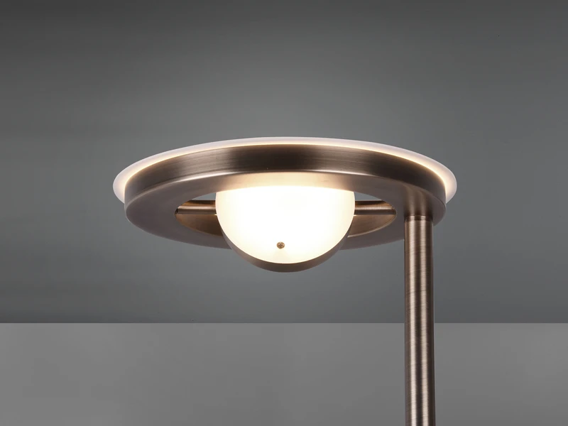 Die Farbgestaltung in Altmessing lässt sich sowohl in klassischen, als auch in modernen Wohnräumen wunderbar integrieren. Die Standlampe ist mit einem fest verbauten SMD-LED Modul mit 32 Watt und 4000 Lumen und einem fest verbauten SMD-LED Modul mit 6 Watt und 600 Lumen ausgestattet.