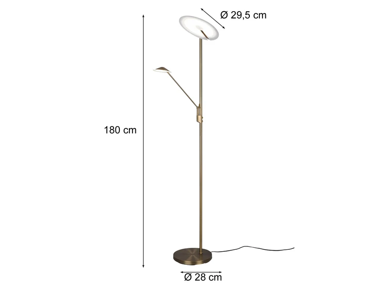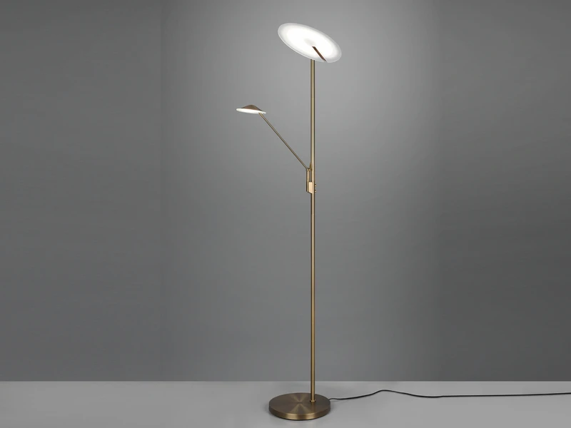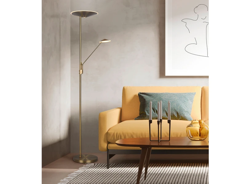Dank der klassischen Farbgestaltung in Altmessing lässt sich die 180 cm hohe Leuchte mit vielen Einrichtungsstilen kombinieren.