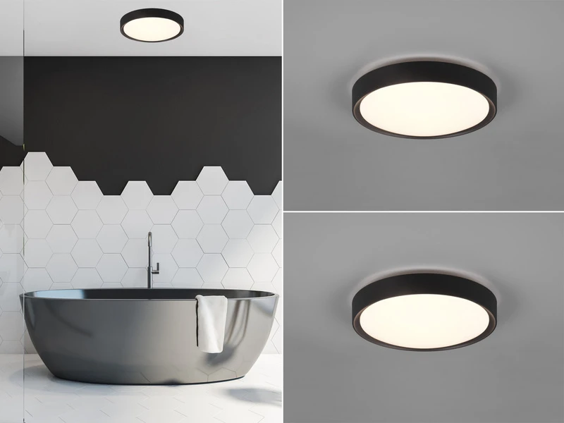 Dank Schutzart IP44 ist die Lampe gegen Spritzwasser geschützt und damit perfekt für alle Feuchträume, wie Badezimmer und Gäste WC geeignet. Die edle Optik in Schwarz matt und Weiß, unterstreicht den minimalistischen Einrichtungsstil und sorgt für ein helles, freundliches Ambiente. Dabei hat die Lampe einen Durchmesser von 33 cm sowie eine Höhe von nur 9 cm.