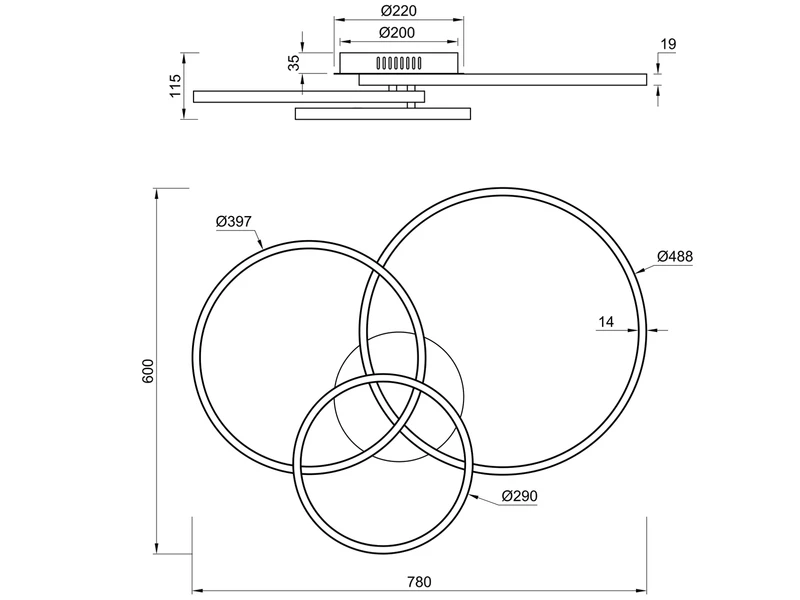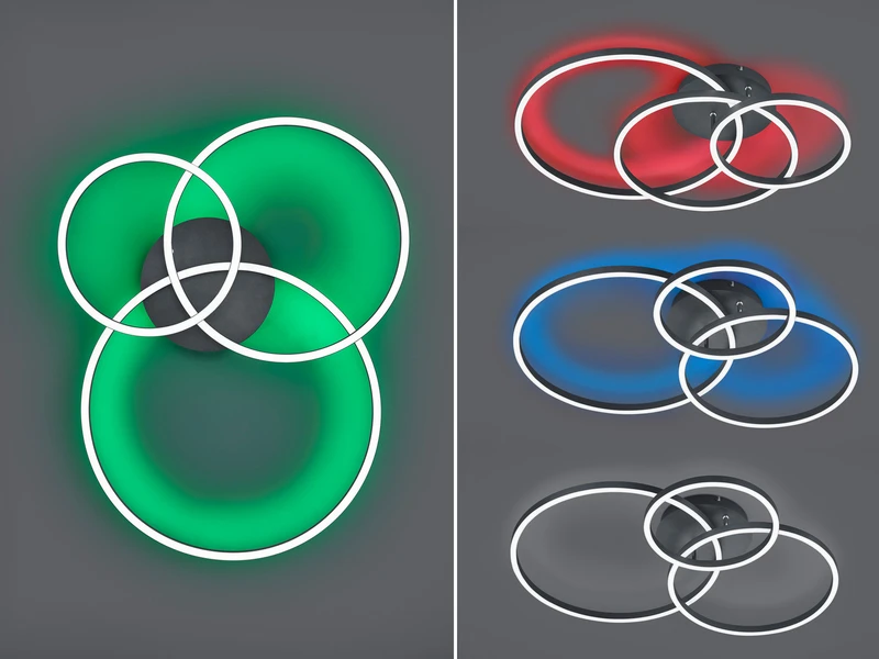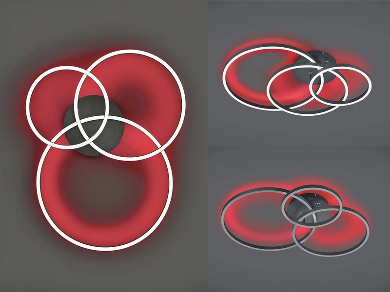 Die drei unterschiedlich großen Ringe der 78 cm breiten Leuchte in der Farbgebung schwarz matt sind schwenkbar, so dass Sie ihr ganz persönliches Beleuchtungsbild schaffen können.