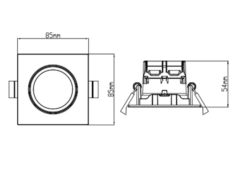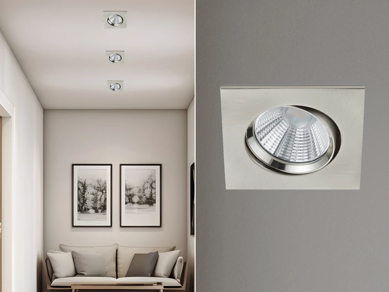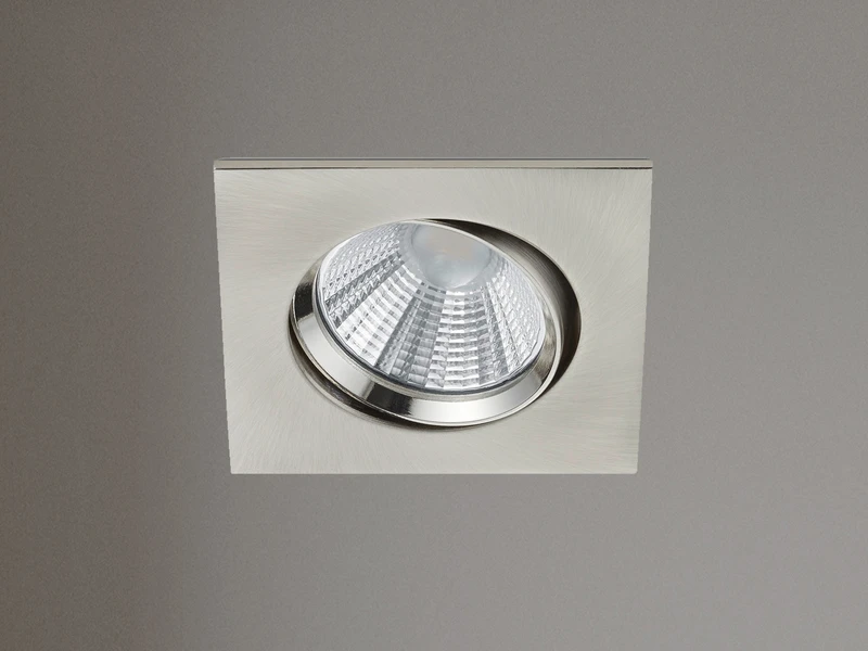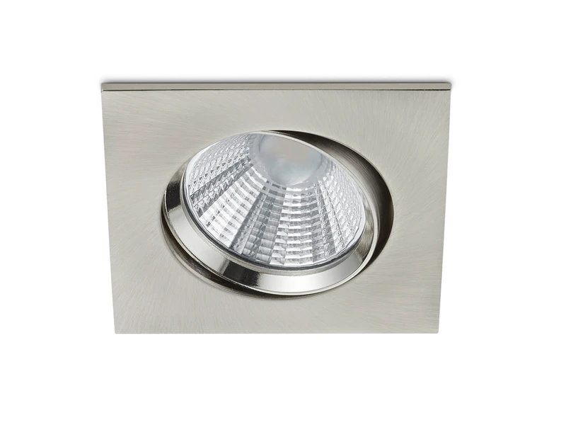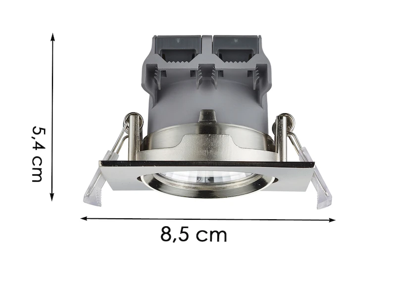 Gefertigt ist der Strahler aus Nickel mattem Metall. Der eckige Spot hat eine Größe von 8,5 x 8,5 cm sowie eine Einbautiefe von 6,8 cm und lässt sich individuell ausrichten.