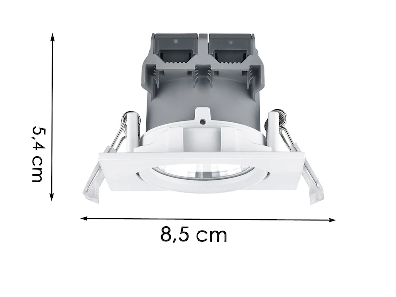 Gefertigt ist der Strahler aus Weiß mattem Metall. Der eckige Spot hat eine Größe von 8,5 x 8,5 cm sowie eine Einbautiefe von 6,8 cm und lässt sich individuell ausrichten.