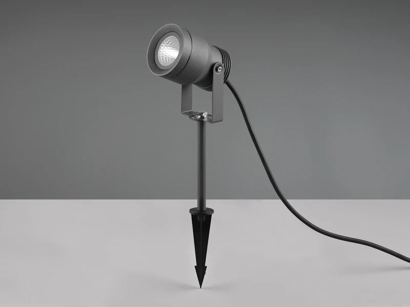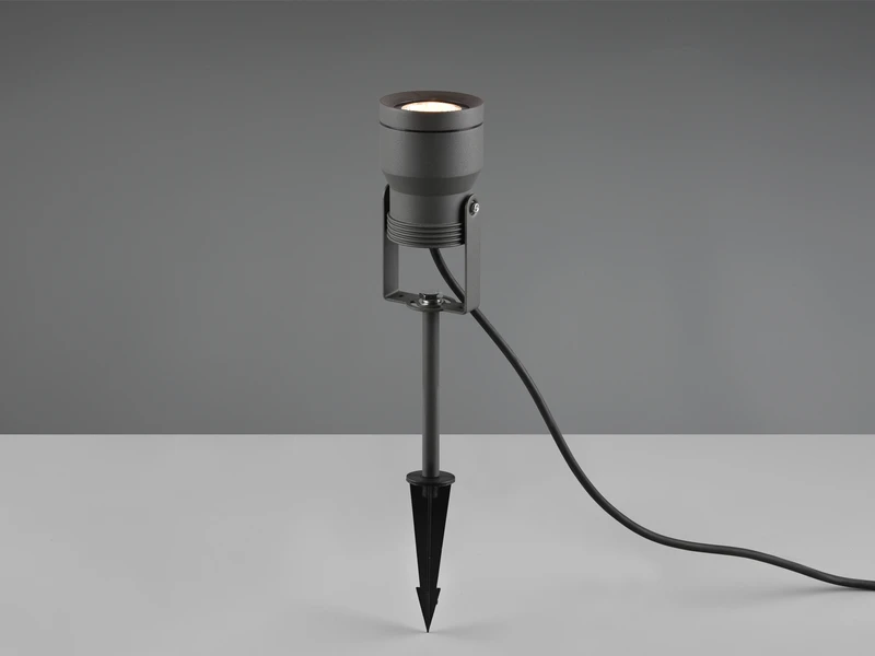 Dank der Schutzart IP65 ist die Leuchte äußerst witterungsbeständig. Das Integrieren der Leuchte in bestehende Gartenkonzepte ist durch die dezente Farbgestaltung in Anthrazit und der Zuleitung von 5 Metern mühelos umsetzbar.