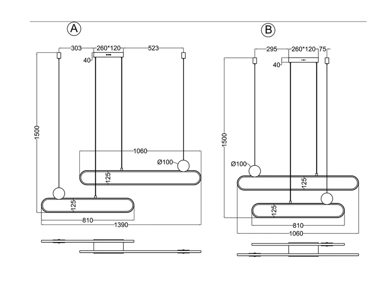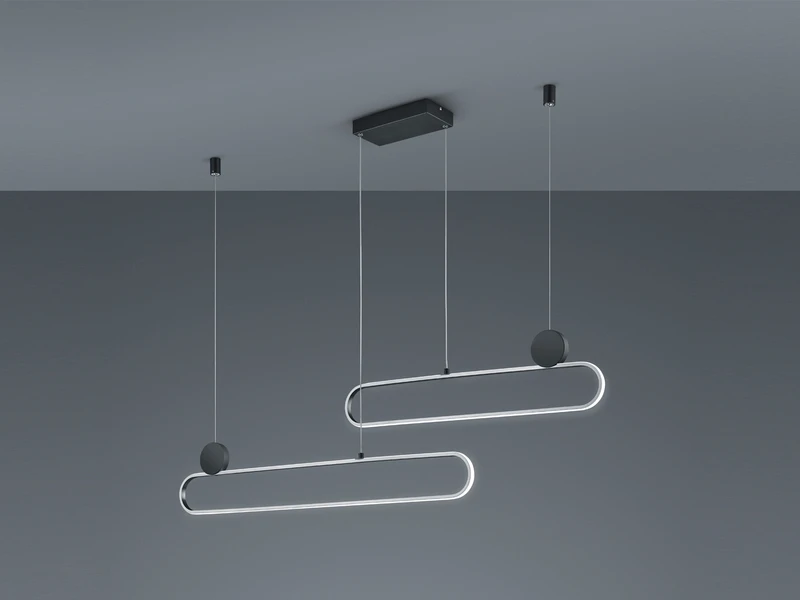 Die 139cm breite, 150cm hohe und 12cm tiefe Hängeleuchte kann in der Lichtstärke und Lichtfarbe variiert und somit flexibel im Wohnzimmer, Schlafzimmer, als Flurlicht oder Büroleuchte verwendet werden. Die Abhängung kann bei der Montage gekürzt werden und die beiden Leuchtringe können auch symmetrisch aufgehängt werden. Die Leuchte ist dann 106cm breit.