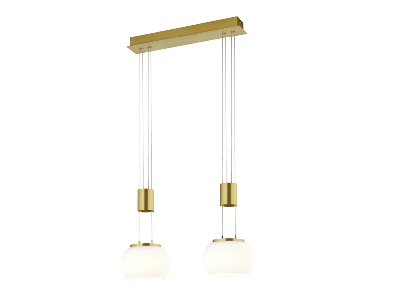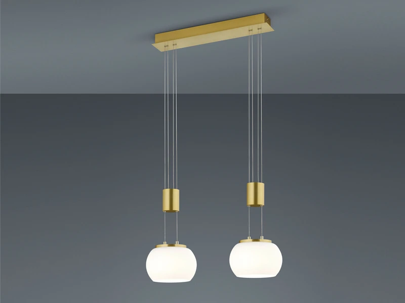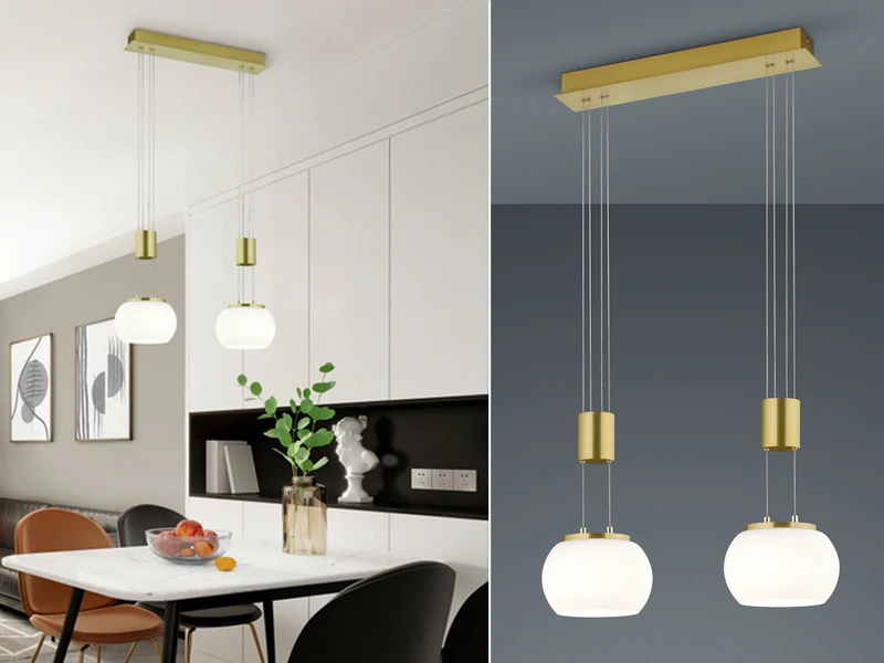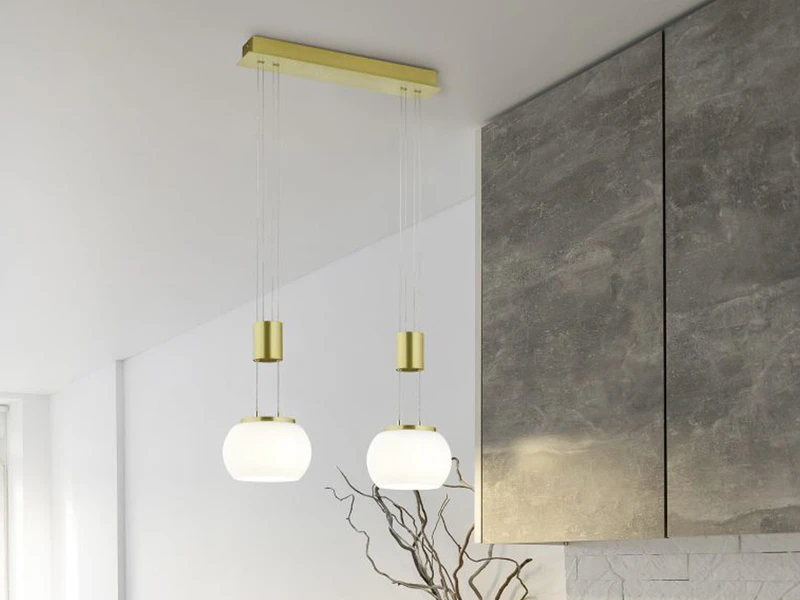 Dank der Farbgestaltung in Messing matt mit weißen Glasschirmen setzt die Leuchte moderne Akzente und kann problemlos mit vorhandenem Mobiliar kombiniert werden.