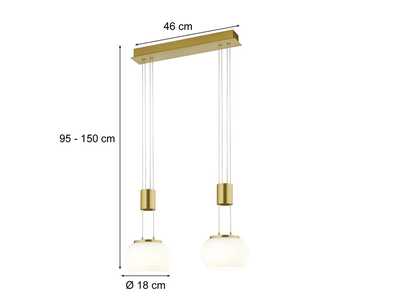 Das 2 flammige Pendel hat eine Breite von 52 cm, der Schirmdurchmesser misst 18 cm und die Abhängung ist von 95 von 150 cm verstellbar. Über dem Wohnzimmertisch oder mittig über dem Esstisch platziert, kommt die Leuchte optimal zur Geltung.