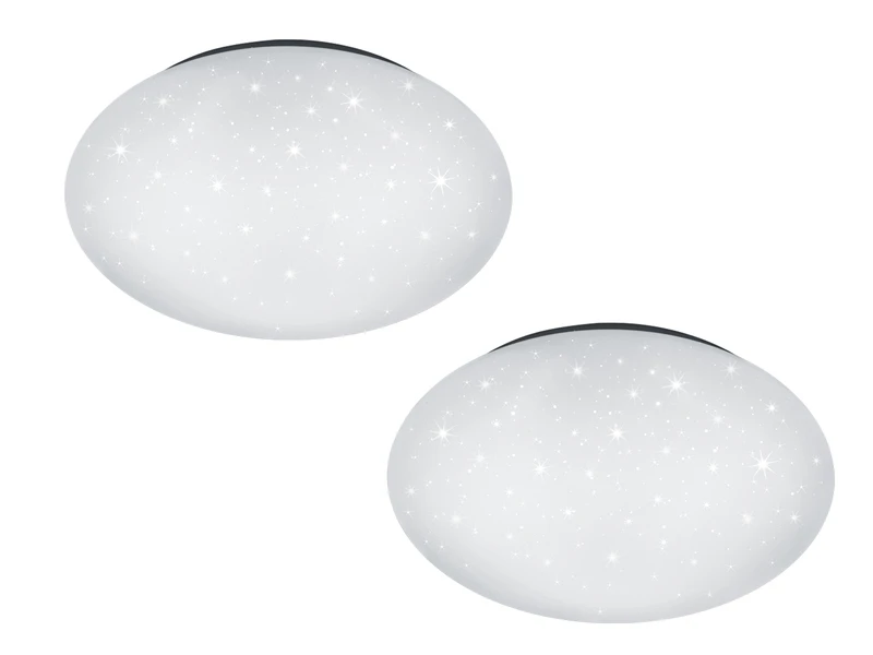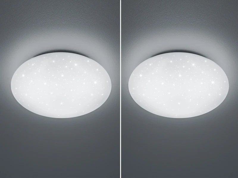 Die Deckenleuchte hat eine Höhe von 8,5 cm und einen Durchmesser von 37 cm. Dadurch kann die flache Lampe auch perfekt zur Wandbeleuchtung genutzt werden. Der weiße Lampenschirm sorgt für ein blendfreies, gleichmäßig helles Licht und komplettiert mit seinem Sterneffekt das harmonische Erscheinungsbild.