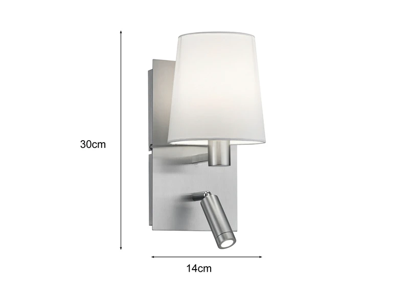 Der Leuchtenkorpus ist aus Metall in Silber Nickel matt gefertigt und harmoniert mit dem eleganten Stoffschirm in Weiß. Dieser hat einen Durchmesser von 14 cm. Mit einer Höhe von 30,8 cm sowie einer Wandausladung von 17,6 cm passt sich die zierliche Lampe ihrer Umgebung dezent an und sorgt für ein gemütliches Licht.