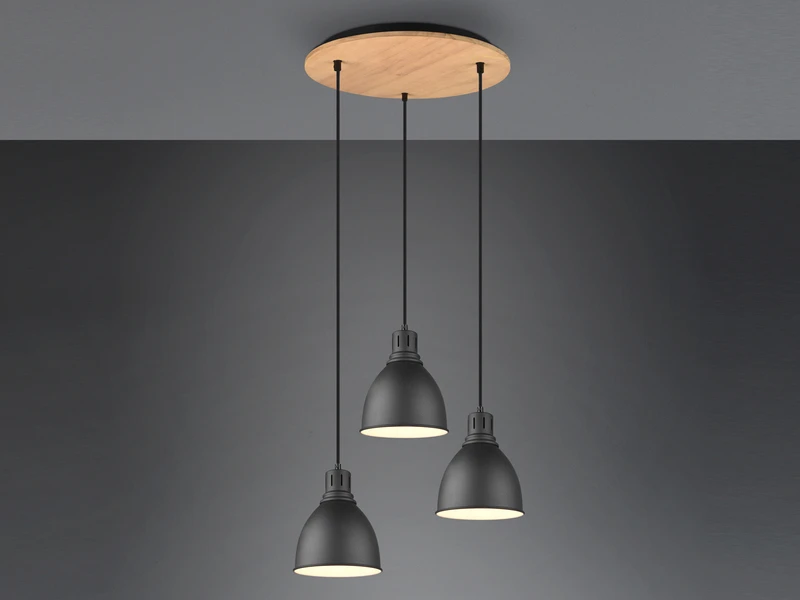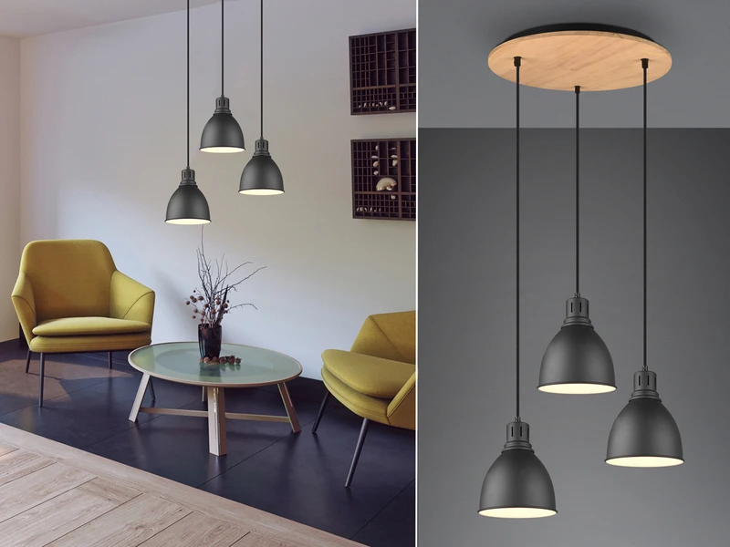 Die drei Lichtquellen können individuell in der Höhe variieren und erzeugen eine wohlige Atmosphäre. Durch die Farbgestaltung in Schwarz matt in Kombination mit Holz, lässt sich die Industrial Style Lampe mühelos in bereits vorhandenes Interieur einfügen und setzt tolle Kontraste.