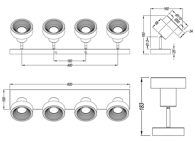 Die Leuchte hat eine Höhe von 19,3cm und eine Breite von 60cm, zudem hat jeder Spot einen Durchmesser von 11cm.