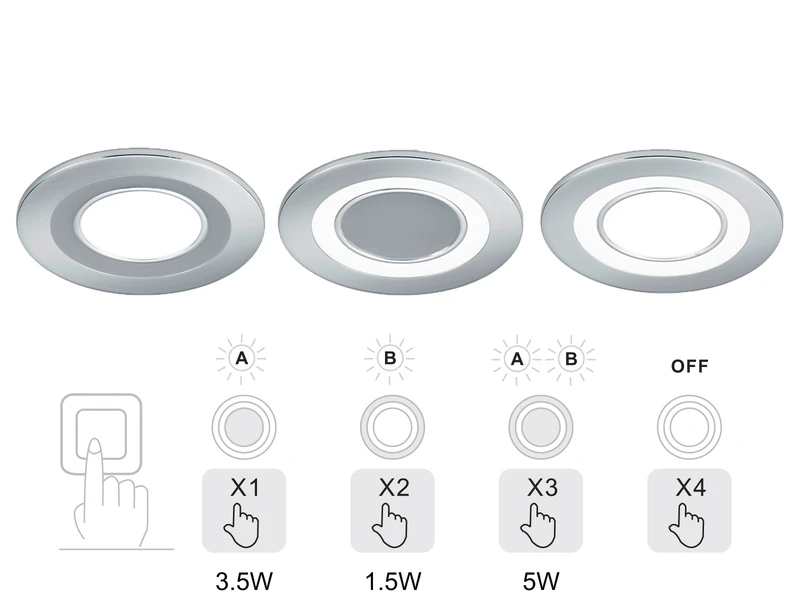 Durch mehrfaches Betätigen des Wandschalters können Sie wählen, ob Sie nur die Hauptleuchte, nur den äußeren Ring oder beide zusammen einschalten wollen.