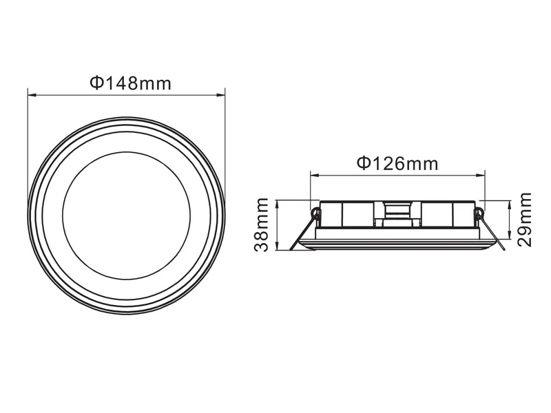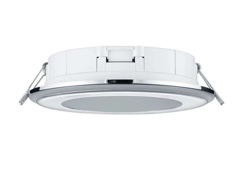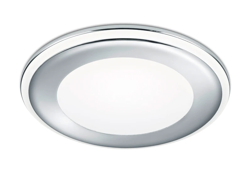 Die Einbaulampe aus Kunststoff hat einen Durchmesser von 14,8 cm und eine Höhe von 3,8 cm. Für den Einbau wird ein 13 cm großer Ausschnitt und eine Einbautiefe von min. 4 cm benötigt.