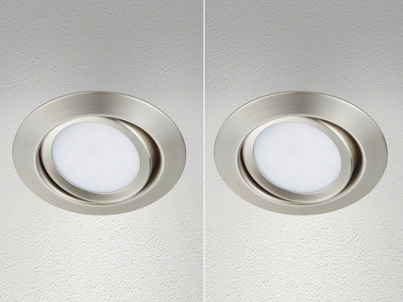 Gefertigt sind die Deckenlampen aus Nickel matttem Metall. Der Spot hat einen Durchmesser von 8,2 cm sowie eine Einbautiefe von 5 cm und lässt sich individuell ausrichten.