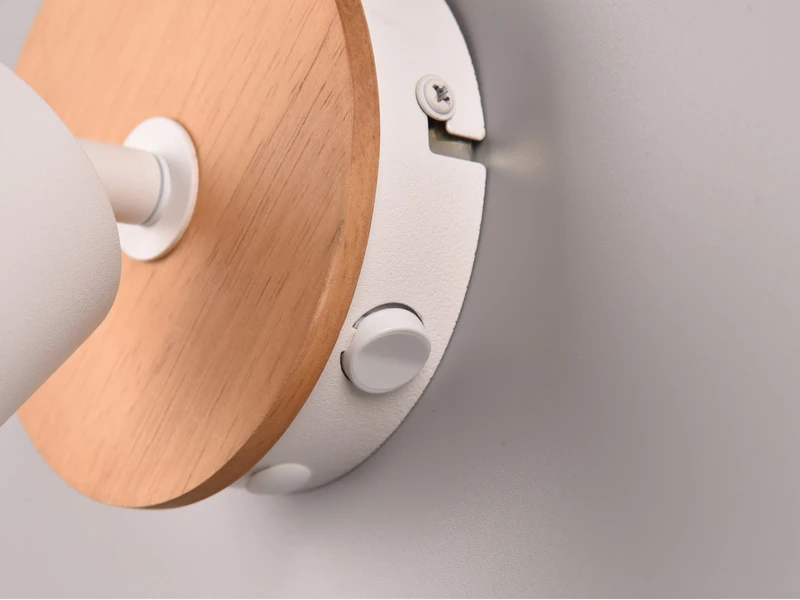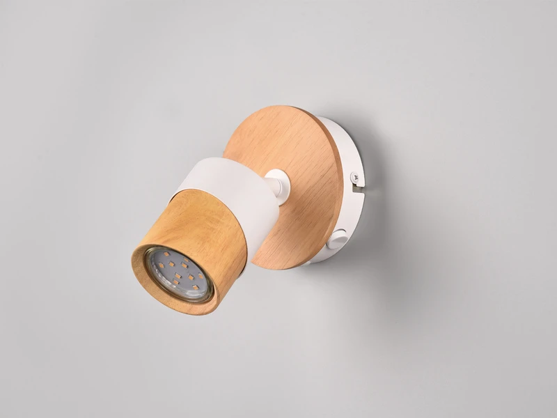 Der Spot überzeugt durch seinen verstellbaren Leuchtenschirm aus Naturholz und weißem Metall (Ø 6,5cm) und setzt mit angenehmen Lichtakzenten den Fokus in Ihre gewünschte Richtung.