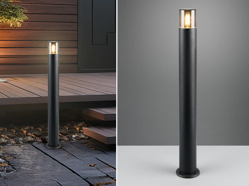 Durch das moderne Erscheinungsbild und dem geradlinigen Desing in zeitlosem Schwarz matt mit rauchfarbigem Kunststoff lässt sich die Wegeleuchte vielfältig kombinieren.